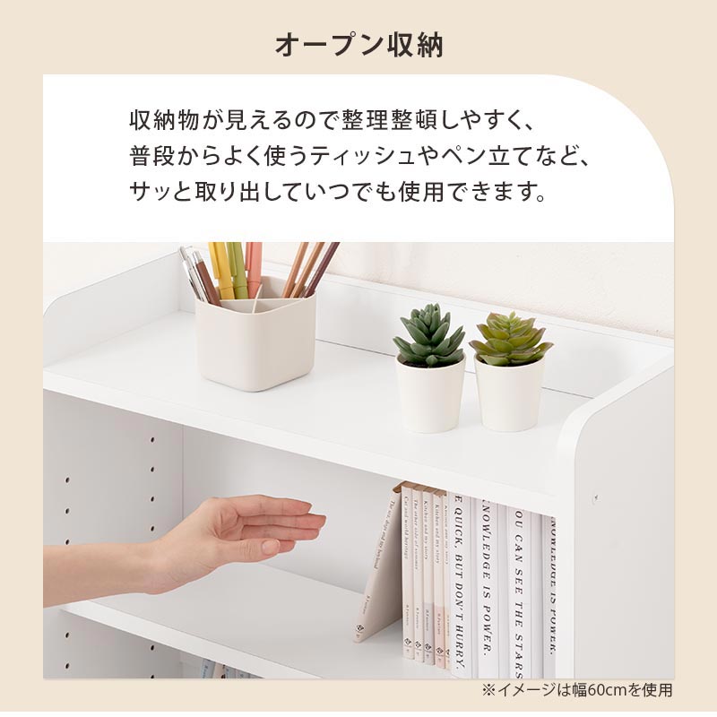 カウンター下などのデッドスペースに収まるスリムサイズで、幅広い空間で収納を実現させるオープン仕様です。
