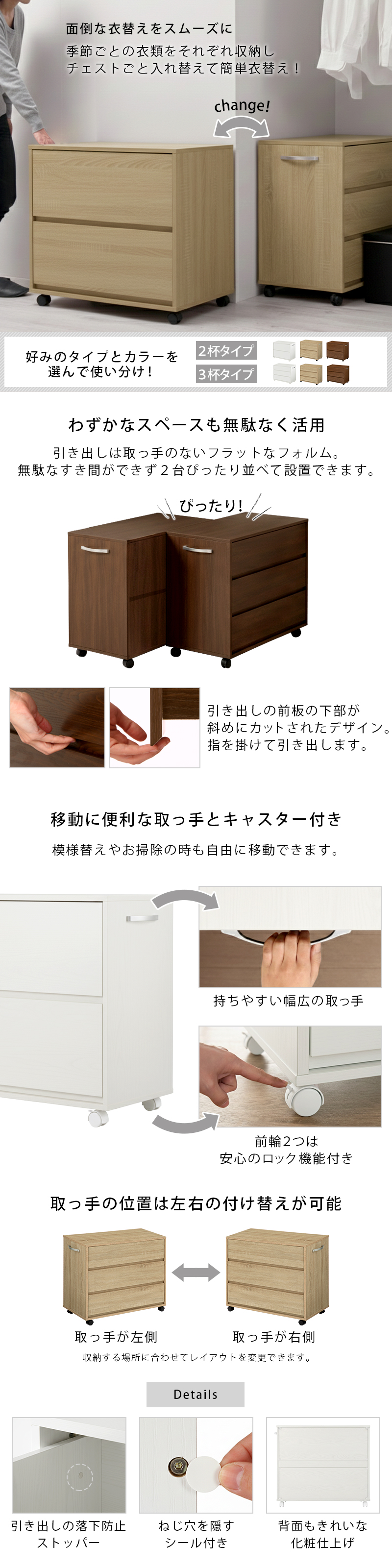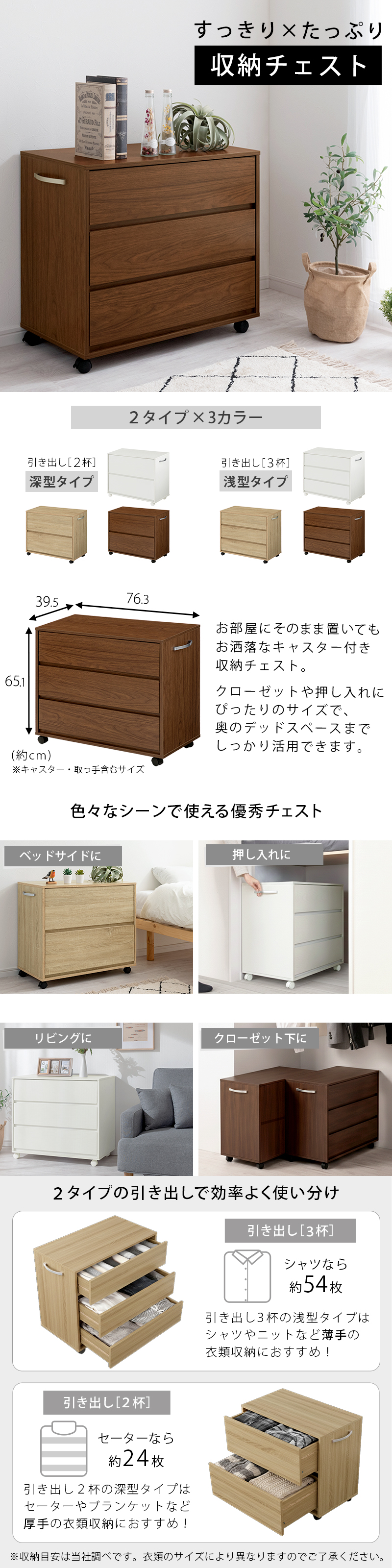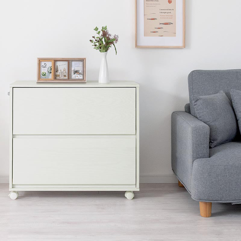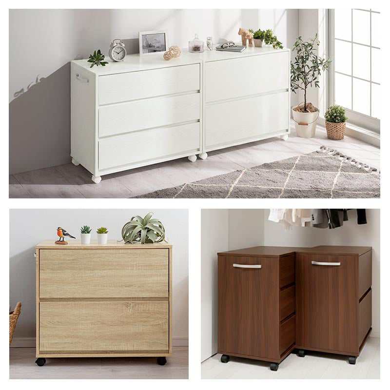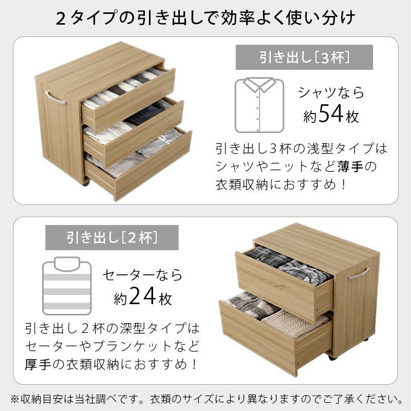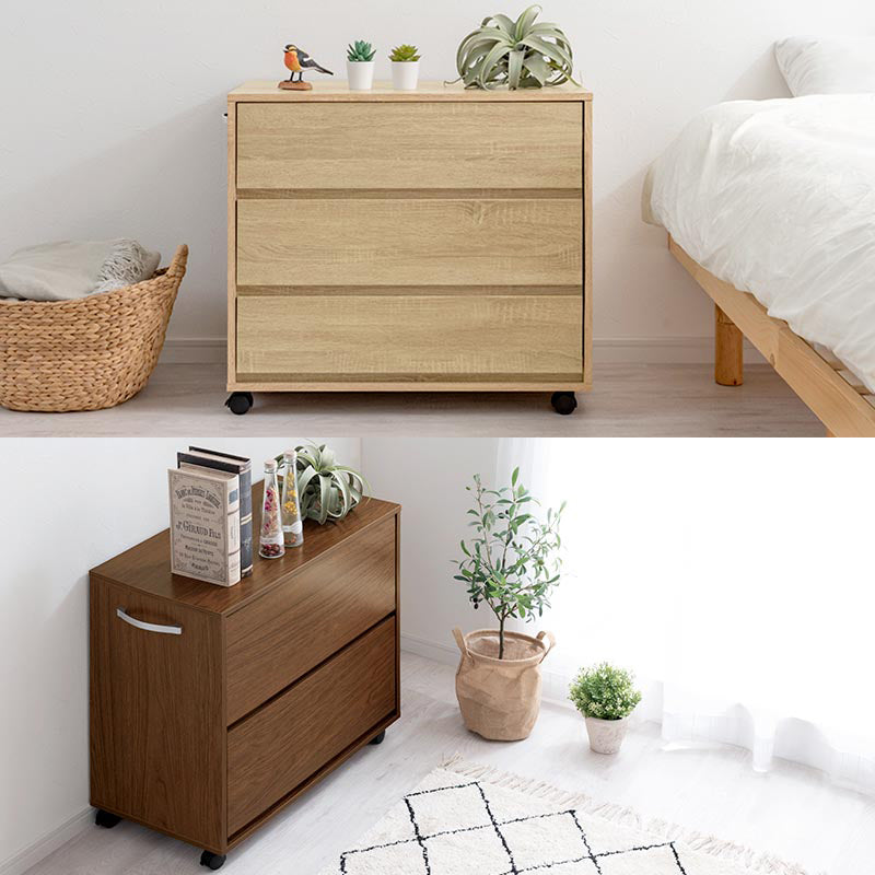 お部屋にそのまま置いてもお洒落に使えるキャスター付き収納チェスト。クローゼットや押し入れ収納にぴったりなサイズ設計です。