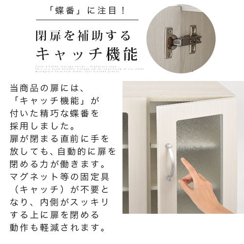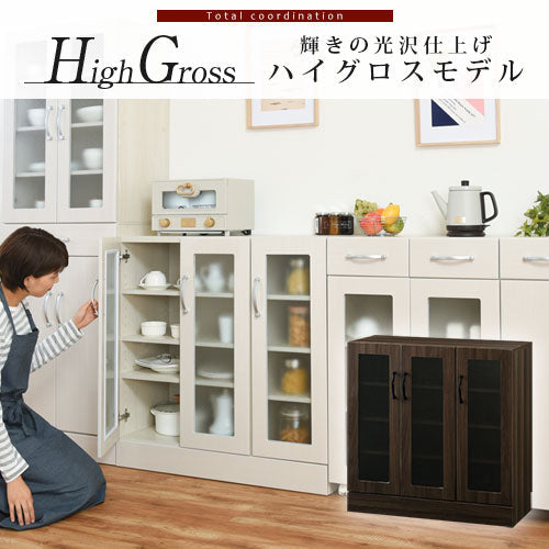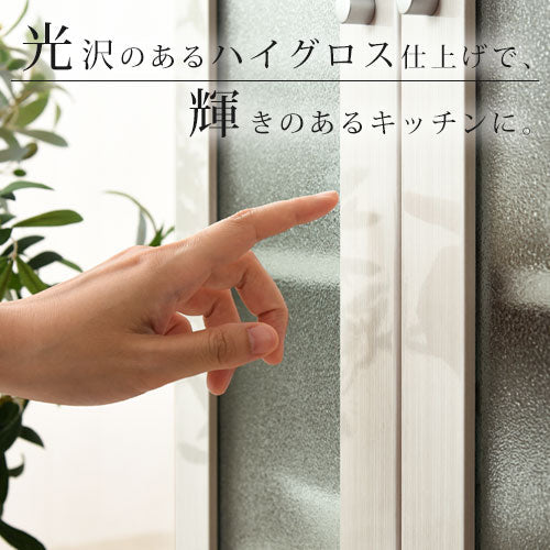 扉前面部にハイグロス仕上げが施された木製食器棚。キッチンに輝きと高級感を演出します。