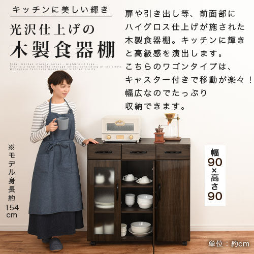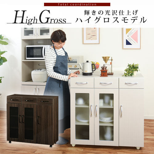 扉や引き出し等、前面部分にハイグロス仕上げが施された木製食器棚。キャスター付きで移動がラクラクなワゴンタイプです。