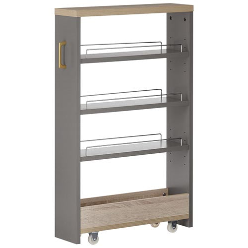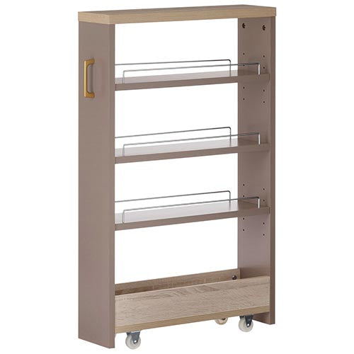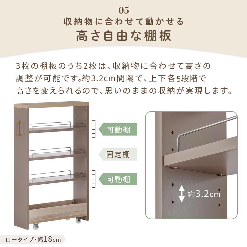 冷蔵庫横の隙間などに収納できる、キャスター付きのワゴンラック。2cm間隔で横幅を選べます。