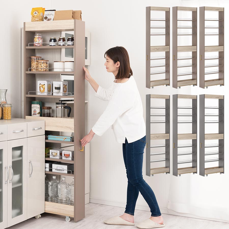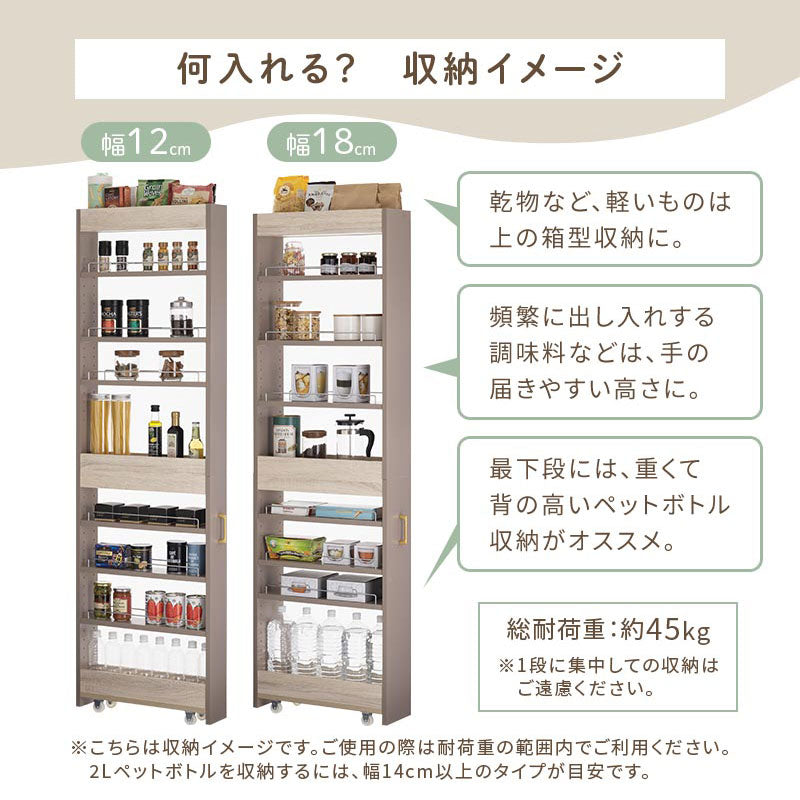 冷蔵庫横の隙間などに収納できる、キャスター付きのワゴンラック。2cm間隔で横幅を選べます。