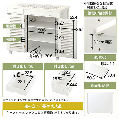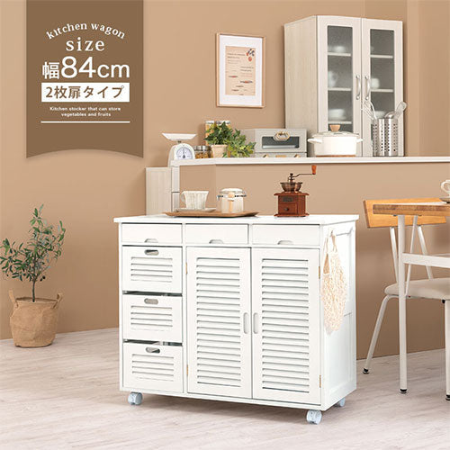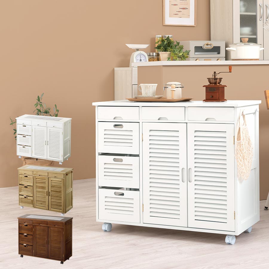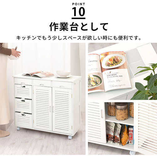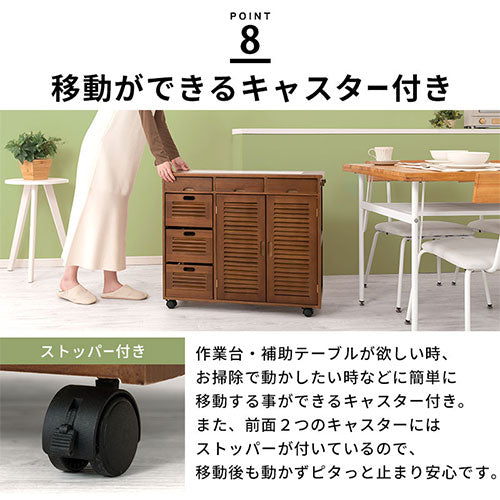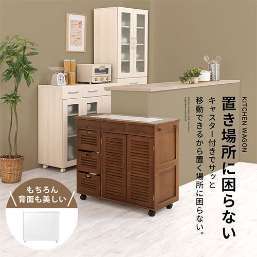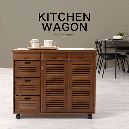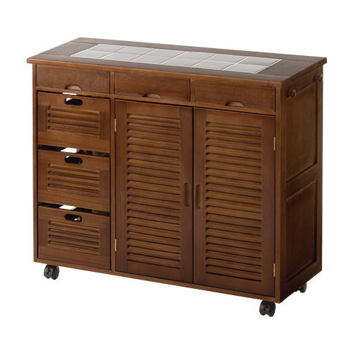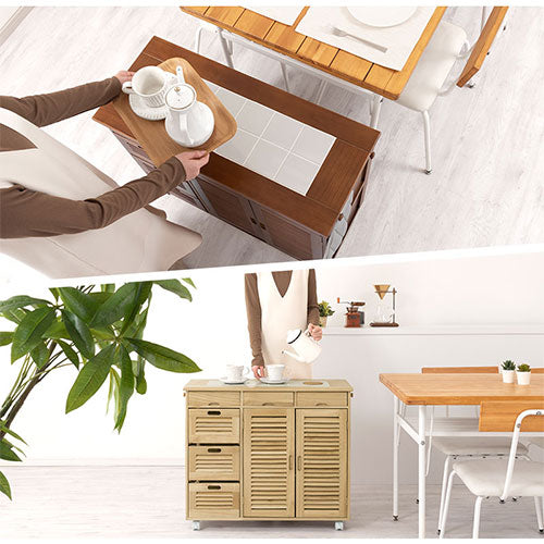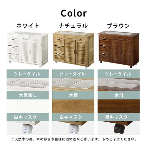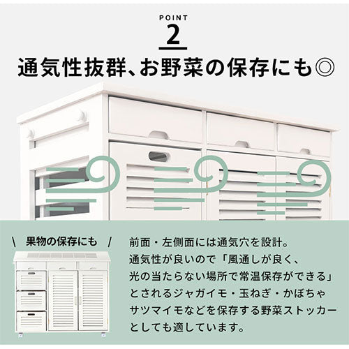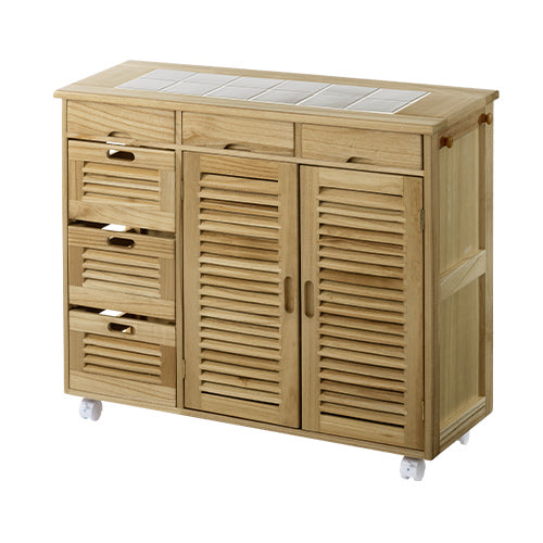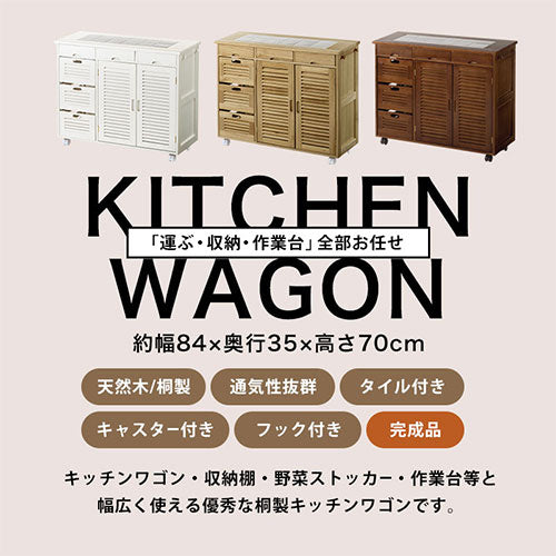 野菜ストッカーが付いた、おしゃれな桐製キッチンワゴン。ルーバー扉で通気性が抜群!天板はタイルで作業台にも役立ちます。