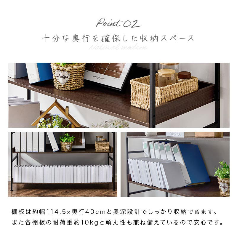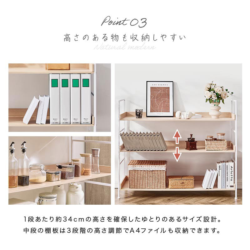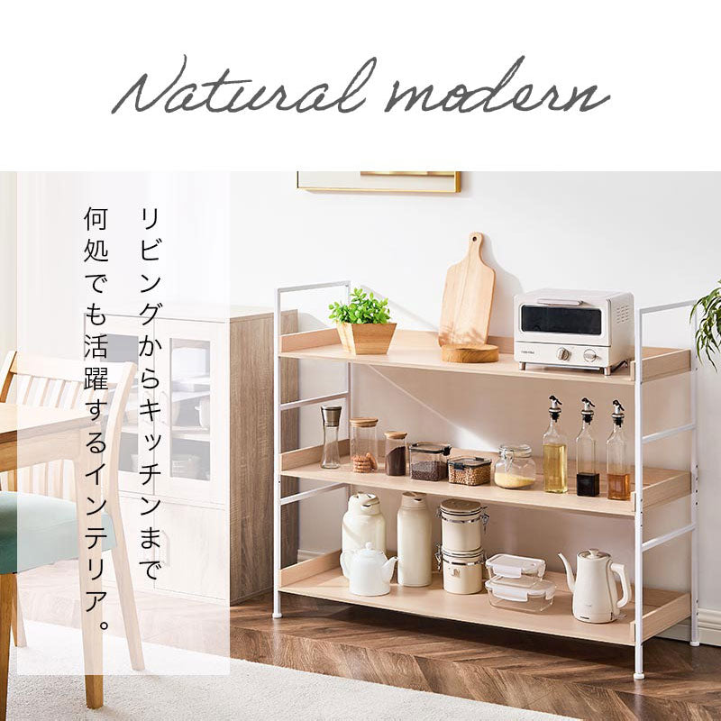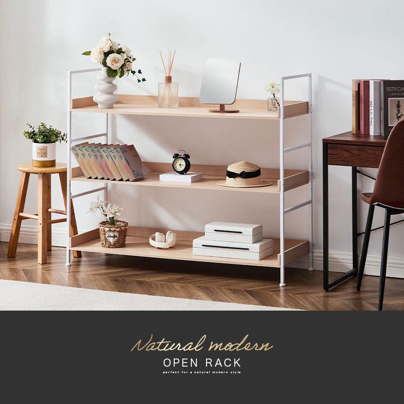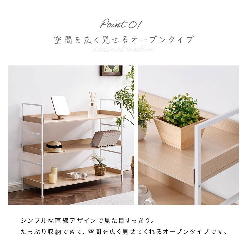 温かみのある棚板とモダンなスチールを組み合わせたオープンラック。ナチュラルモダンなスタイルにぴったりのアイテムです。