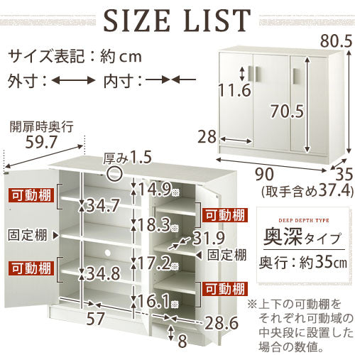 シューズボックス 3扉 奥深タイプ 幅90×奥行35cm