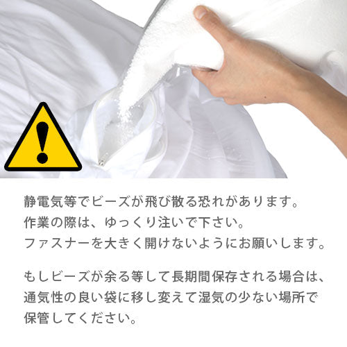 抜群の触り心地の詰め替え用ビーズ。一般的なビーズは大体約2~3mmですが、こちらは直径約0.5mm。ビーズの大きさが小さい程、弾力性もアップ。目が詰まっているのでモチモチです。